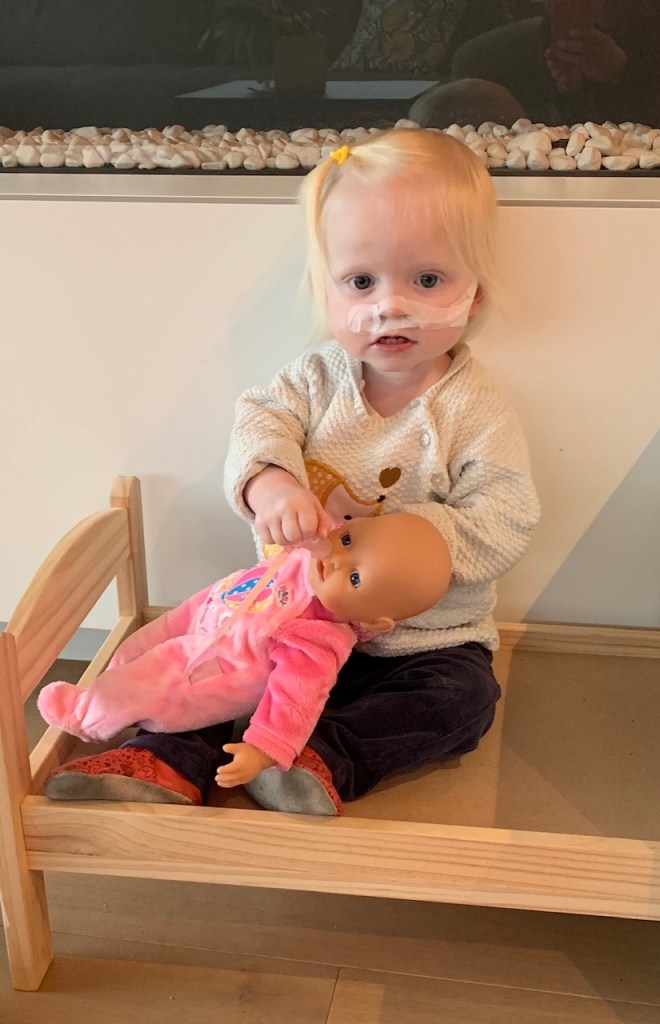Leuk weetje: Eefje haar poppemie is nog niet sondevrij. Ze speelt heel graag met de poppen en ze heeft ook wat spuitjes van de sondevoeding in haar speelgoedbak. De pop krijgt wel nog steeds eten via de spuit 😀