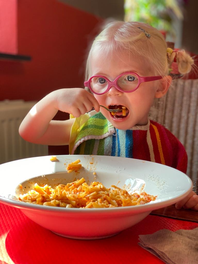 Vroeger moesten we ook een aparte rugzak vullen met een voedingspomp, spuiten, sondevoeding en een heleboel tetradoeken en reservekledij voor het vele overgeven van Eefje voor we deur uit konden. Als we ergens waren moesten we een rustig hoekje zoeken waar we haar probeerden te laten eten en waar we nadien sondevoeding konden toedienen zonder al te veel nieuwsgierige blikken van voorbijgangers. We moeten er soms al eens bewust bij stilstaan en even denken aan hoe het toen was om te blijven beseffen hoe goed we het nu hebben.