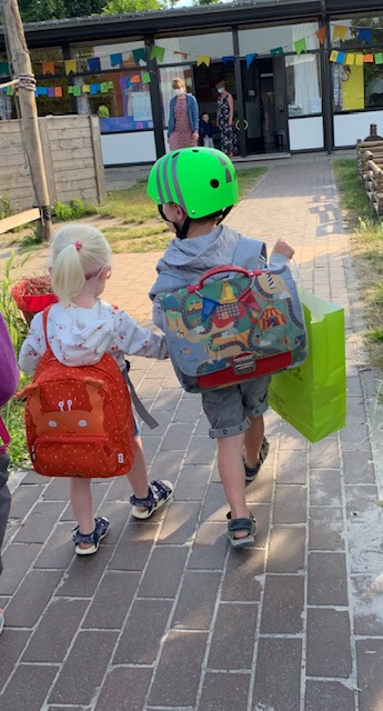 We reden met de fiets naar school, daar toegekomen gaven we hen nog een dikke knuffel en een kus en wensten we Eefje een heel fijne eerste schooldag. Aangezien er door de corona maatregelen geen ouders op de school mogen komen, moeten ze nu zelf naar hun klas wandelen. Maar uiteraard was dat een taak die grote broer Floris met veel plezier op zich nam. Hij gaf zijn zusje een handje en wandelde met haar tot aan haar klas. Wat was dat mooi om te zien, het deed me helemaal smelten. En daar waren ze dan, de tranen… Tranen van ontroering en dankbaarheid. Ik was zo blij dat ze gewoon naar school kon na de lange weg die ze had afgelegd. Heel lang had ik dit niet voor mogelijk gehouden en me hier veel zorgen over gemaakt en nu kan ze gewoon naar school. Met een boekentasje vol lekkers 🙂
